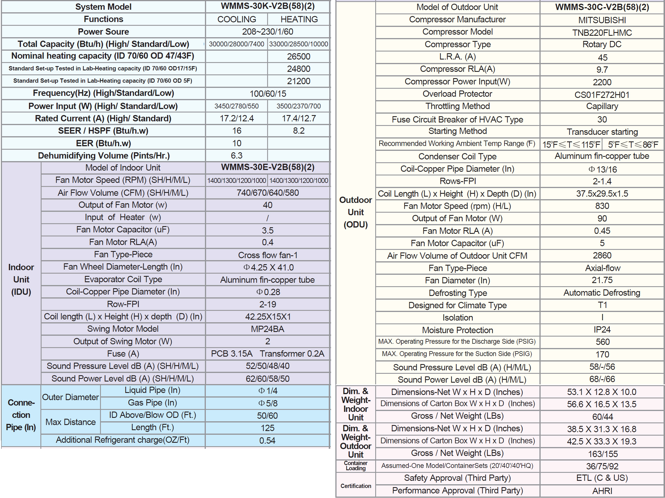 2.5 Ton Inverter DC Mini Split - Heat Pump: Enjoy full season comfort during the summer or winter with this 30000 BTU Inverter Mini Split with 30,000 BTU Heat Pump. With a 16 SEER rating coupled with Advanced DC Inverter technology provides the benefits of low operation temperatures, rapid cooling / heating as well as maximum energy efficient operation. Comes fully charged with environmentally friendly R410A .